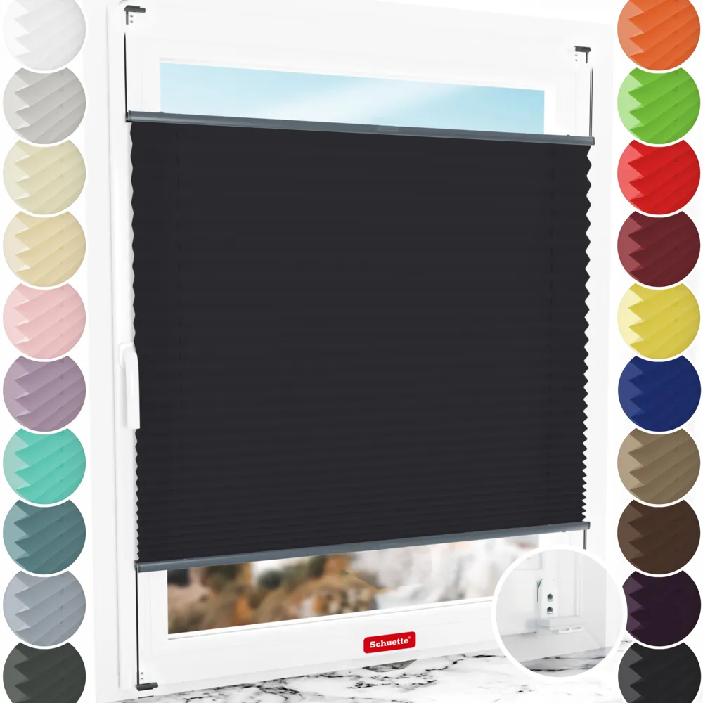- Caratteristiche delle tende plissettate Schuette® con foratura: Regolazione continua (Up&Down), doppia tensione (NO oscillazione), profili speciali in alluminio (NO piegatura/rottura), completamente assemblate per quanto possibile (NO! infilare il cordone della tenda plissettata / NO! montaggio lungo di molte parti singole)