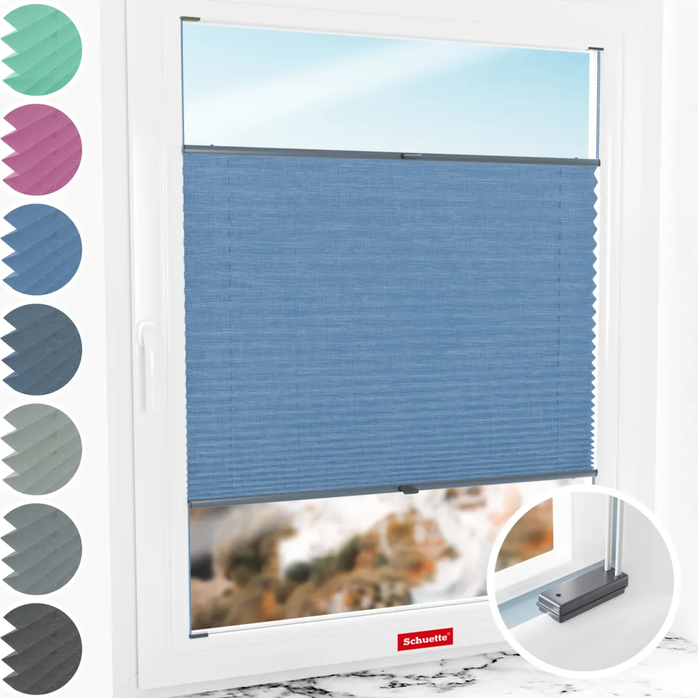 Schuette® Tenda plissettata su misura con foratura • Collezione Melange: Deep Sea (Blu) • Suprafix Supporti “Per l’avvitamento” • Colore del profilo: Antracite