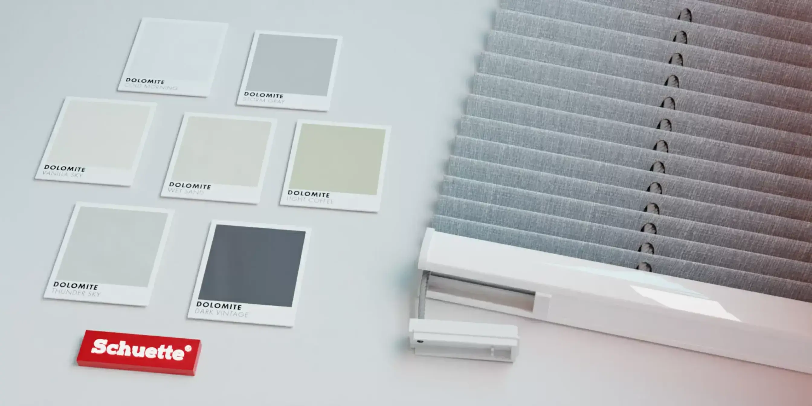 Schuette® Tenda plissettata su misura senza foratura • Collezione Dolomite: Cold Morning (Grigio) • Suprafix Supporti “Double 2in1” • Colore del profilo: Bianco