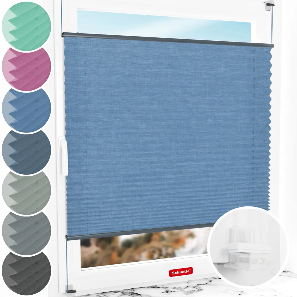Schuette® Tenda plissettata su misura senza foratura • Collezione Melange: Deep Sea (Blu) • Suprafix Supporti a morsetto “Incognito X” • Colore del profilo: Antracite