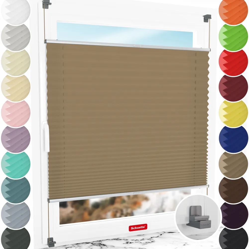 Schuette® Tenda plissettata su misura senza foratura • Collezione Premium: Morning Coffee (Marrone chiaro) • Suprafix Supporti a morsetto “X” • Colore del profilo: Argento