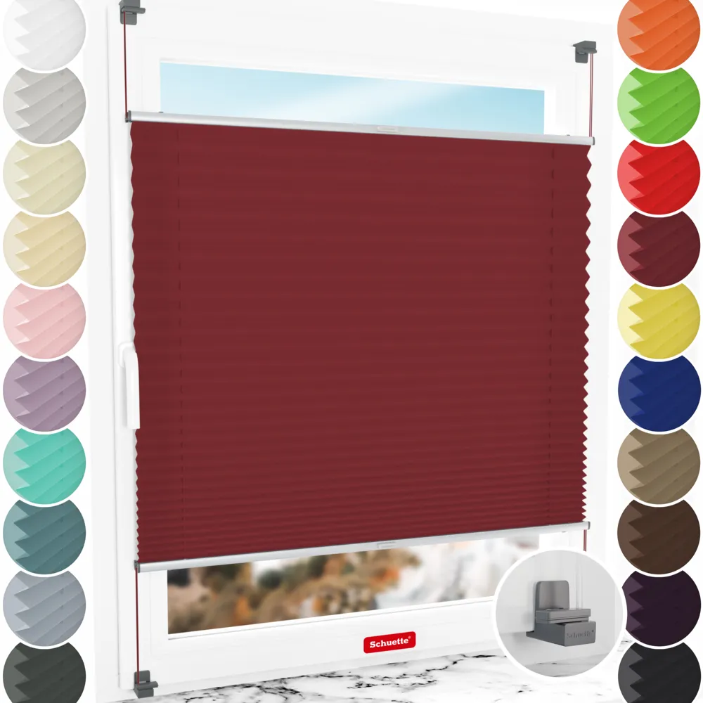 Schuette® Tenda plissettata su misura senza foratura • Collezione Premium: Ruby Riddle (Rosso scuro) • Suprafix Supporti a morsetto “X” • Colore del profilo: Argento