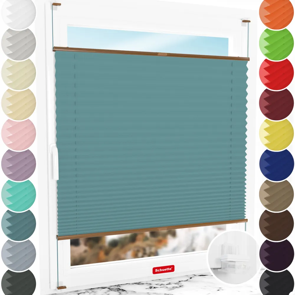 Schuette® Tenda plissettata su misura senza foratura • Collezione Thermo: Teal Aura (Blu) • Suprafix Supporti a morsetto “Incognito X” • Colore del profilo: Rovere
