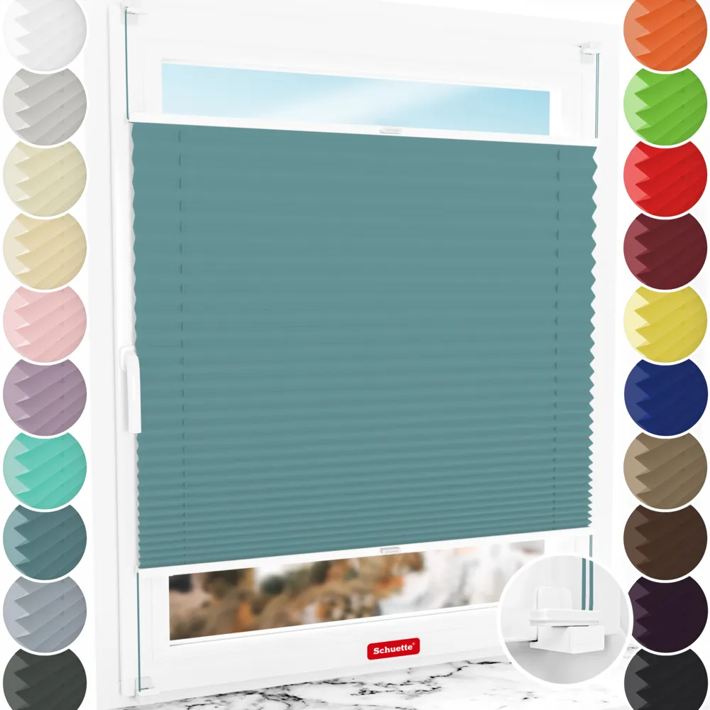 Schuette® plisségordijn zonder boren op maat • Thermo collectie: Teal Aura (Turkoois) • Suprafix klembeugel "X" • Profielkleur: Wit