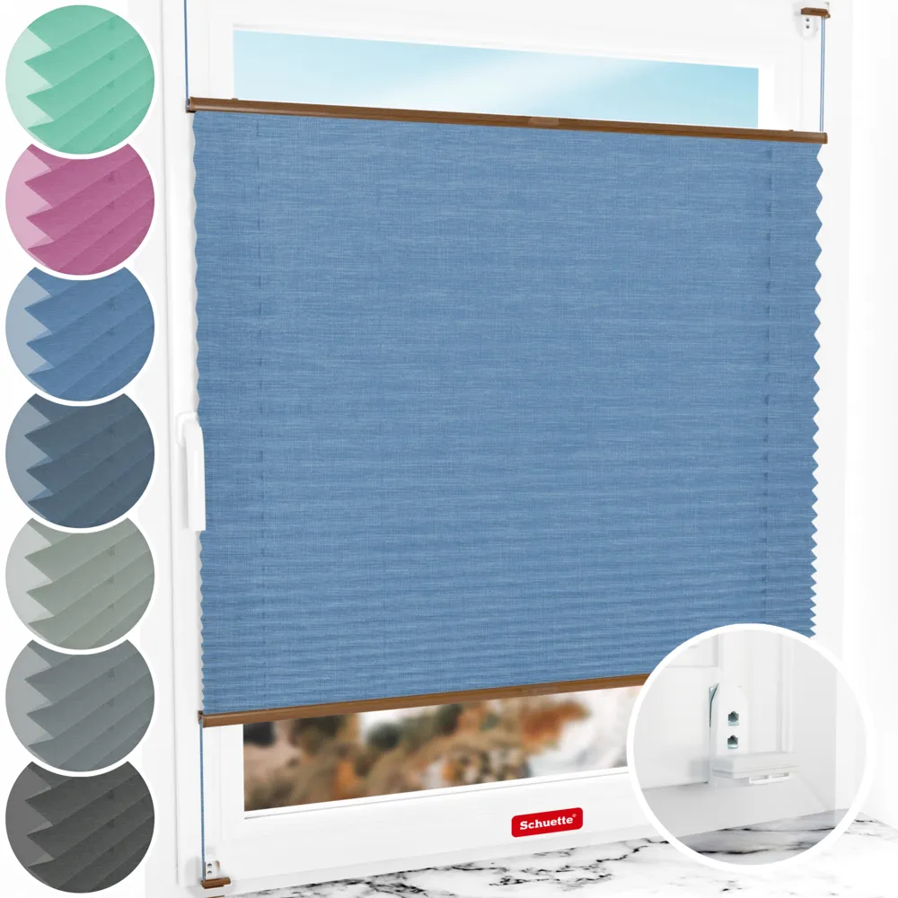 Schuette® Plisségordijnen met boren op maat • Melange collectie: Deep Sea (Blauw) • Suprafix "Double 2in1" schroef- & klembevestiging • Profielkleur: Eik