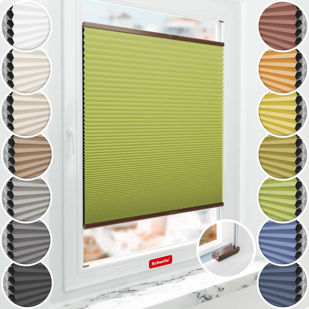 Schuette® verduisterend honingraat plisségordijn met boren op maat • Blackout x Honey collectie: Green Tea (Groen) • Suprafix beugels "Met boren" • Profielkleur: Bruin