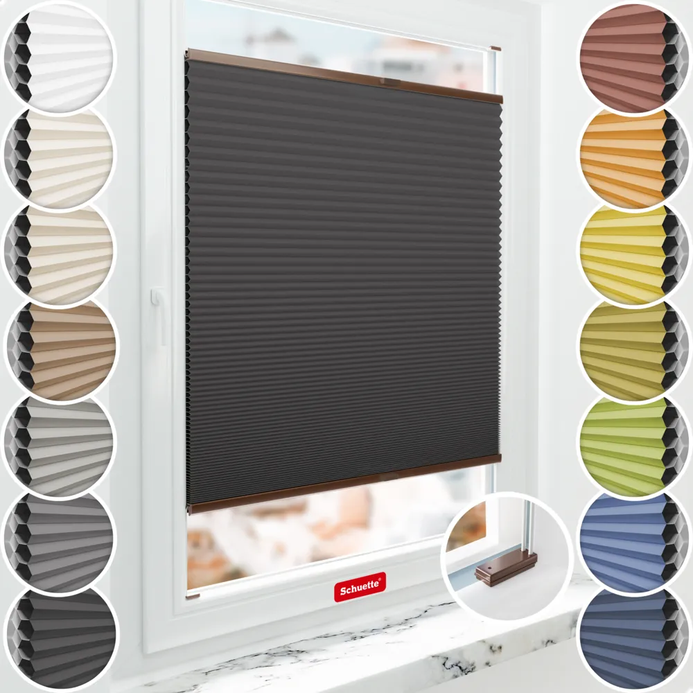 Schuette® verduisterend honingraat plisségordijn met boren op maat • Blackout x Honey collectie: Starry Night (Zwart) • Suprafix beugels "Met boren" • Profielkleur: Bruin