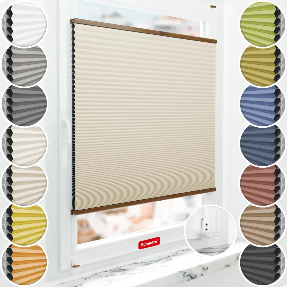 Schuette® verduisterend honingraat plisségordijn met boren op maat • Blackout x Honey collectie: The Dune (Beige) • Suprafix "Double 2in1" schroef- & klembevestiging • Profielkleur: Eik