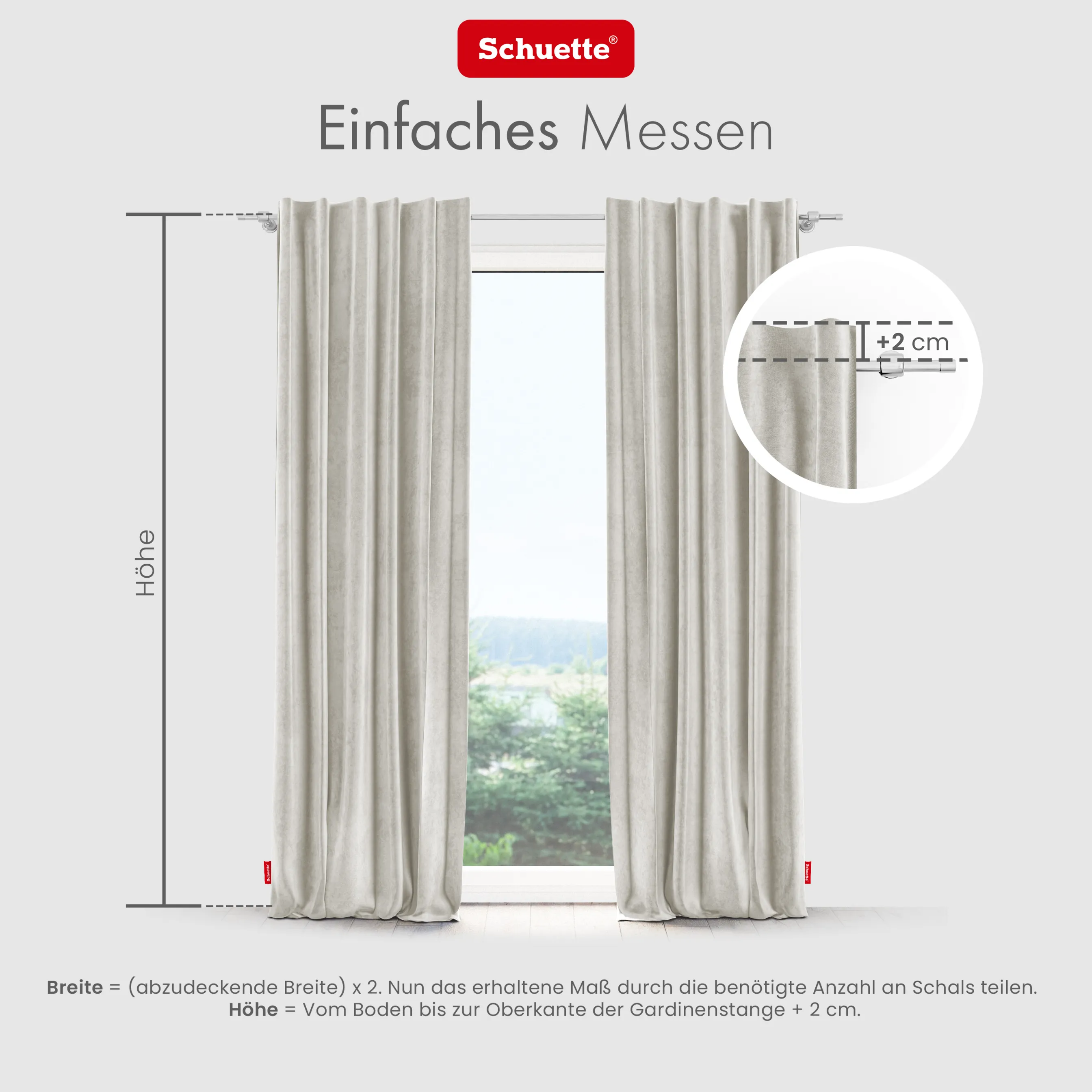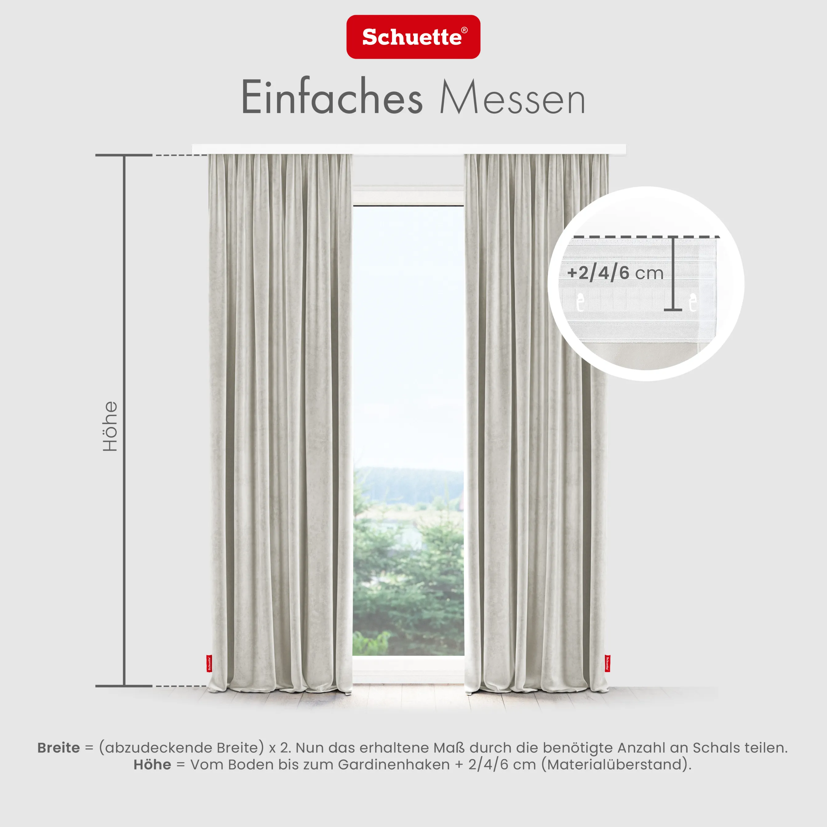 - Meetinstructies: a) Montage aan een stang: Hoogte = vanaf de vloer tot aan de bovenrand van de gordijnstang, plus minimaal 2 cm zodat het gordijn licht over de vloer strijkt; b) Montage met klemmen: Hoogte = vanaf de vloer tot het punt waar de klem de stof bovenaan vastpakt; c) Montage met haken: Hoogte = vanaf de vloer tot de gordijnhaak + 2 / 4 / 6 cm (de gewenste hoeveelheid stof boven de haak) × Breedte = (te bedekken breedte) × 2. Vervolgens de verkregen maat delen door het benodigde aantal gordijnbanen. Alle door Schuette® aangeboden gordijnmaten worden aangegeven als breedte × hoogte. Bij breedtes boven 135 cm worden twee gordijnen aan elkaar genaaid.