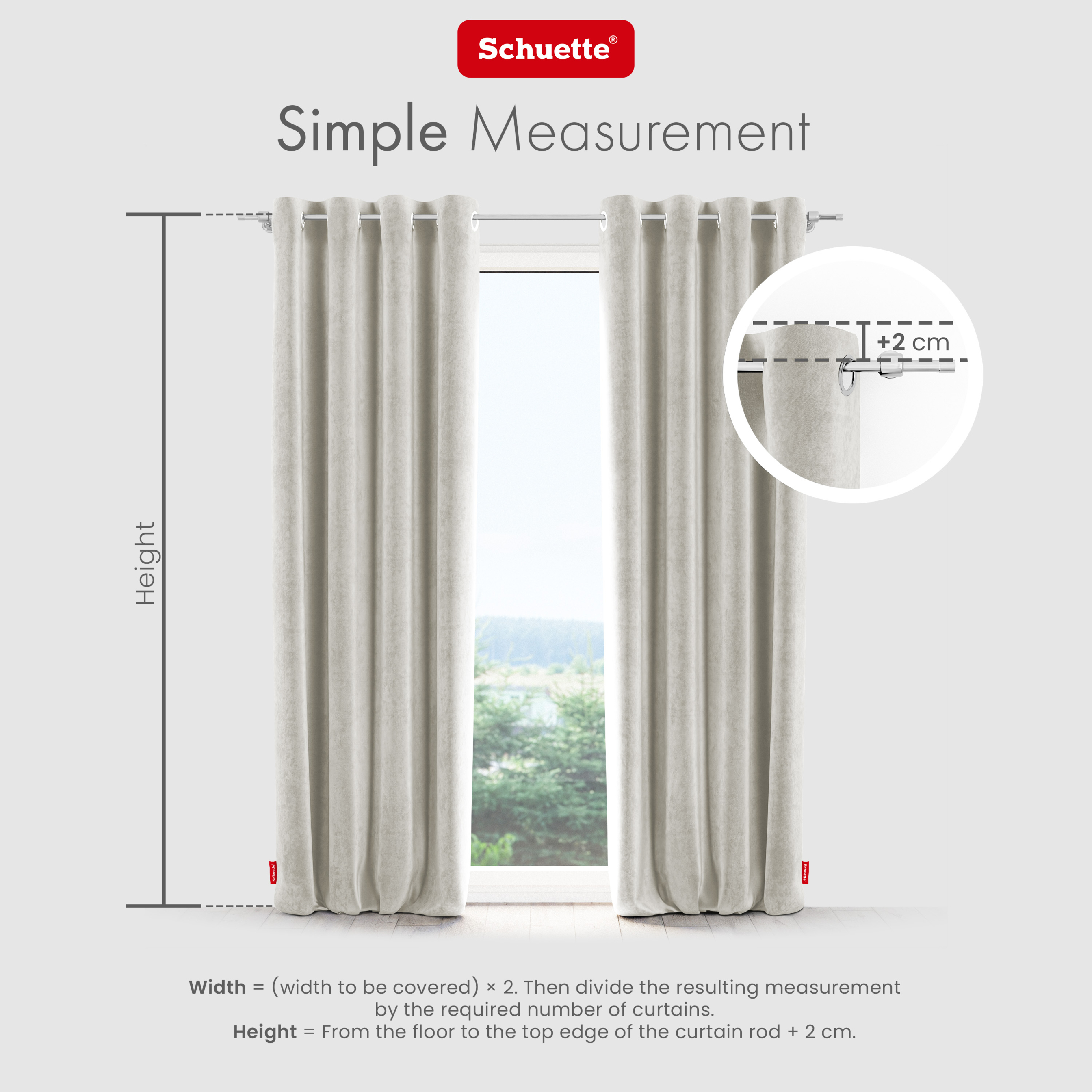 - Måleanvisning: Høyde = Mål gardinhøyden fra gulvet til gardinskinnen eller toppen av gardinstangen og legg til minst 4 cm slik at gardinen minst berører gulvet. Bredde = (bredde som skal tildekkes) x 2. Del deretter det resulterende målet med ønsket antall skjerf; alle Schuette®-gardinmål som tilbys er bredde x høyde.