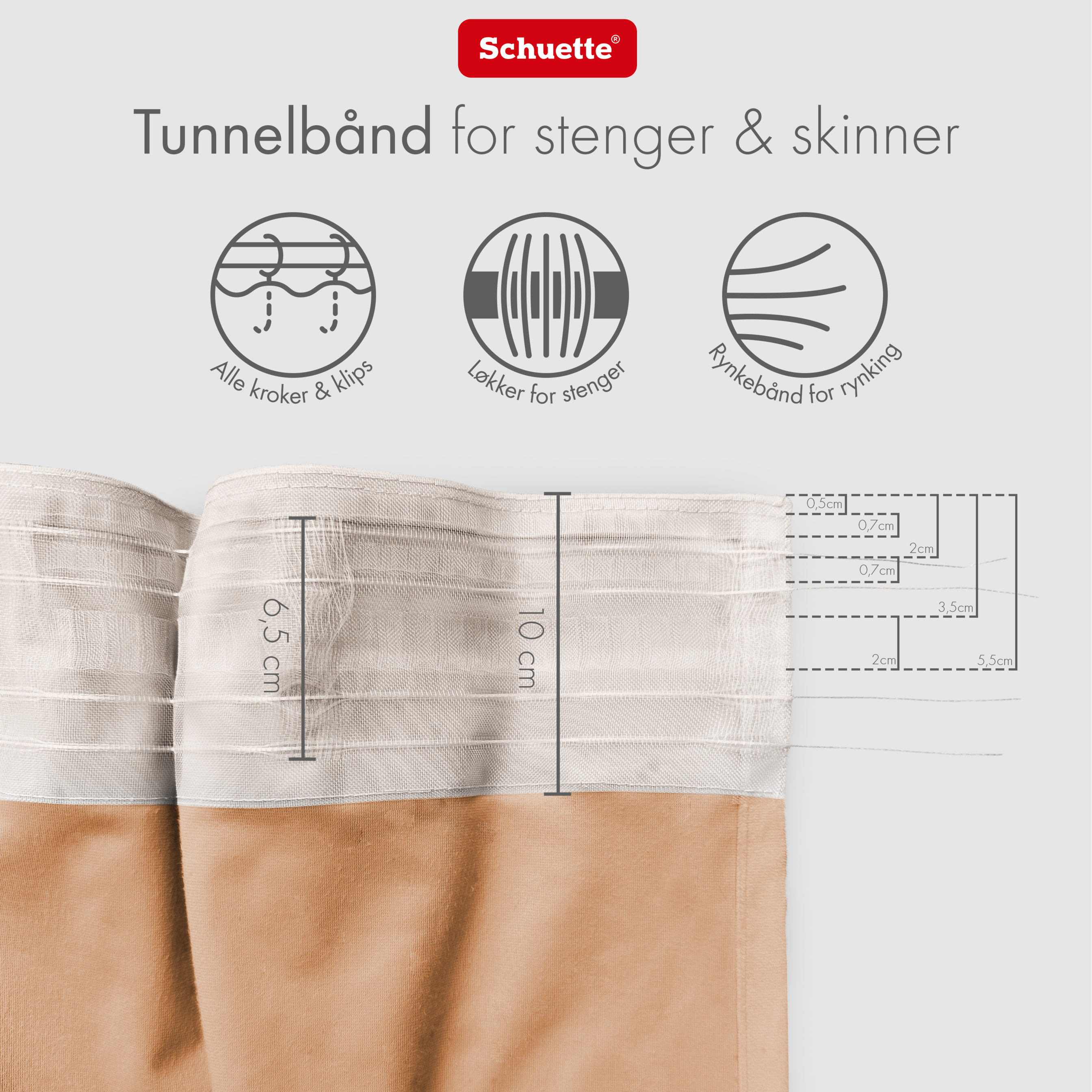 - Funksjoner Schuette® mørklægningsgardin med tunnelbånd: Helt ugjennomsiktig gardinsjal laget av fløyel av høy kvalitet med høy mørklægningseffekt; Høy lysbeskyttelse og forbedret romakustikk (lydisolering og støyreduksjon); Energibesparende termisk effekt (redusert varme- og kuldeutveksling ved vinduet); Håndsydd lokalt med det høyeste håndverksmessige nivået i vår egen familiemanufaktur spesielt for deg.