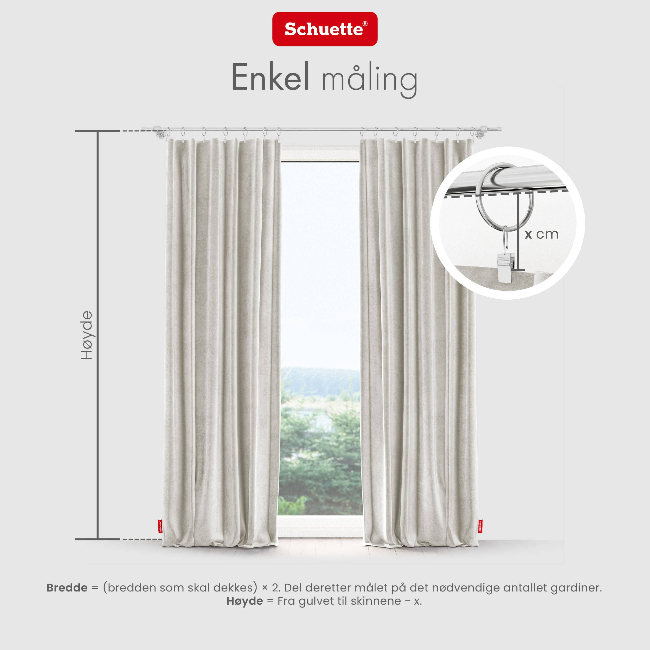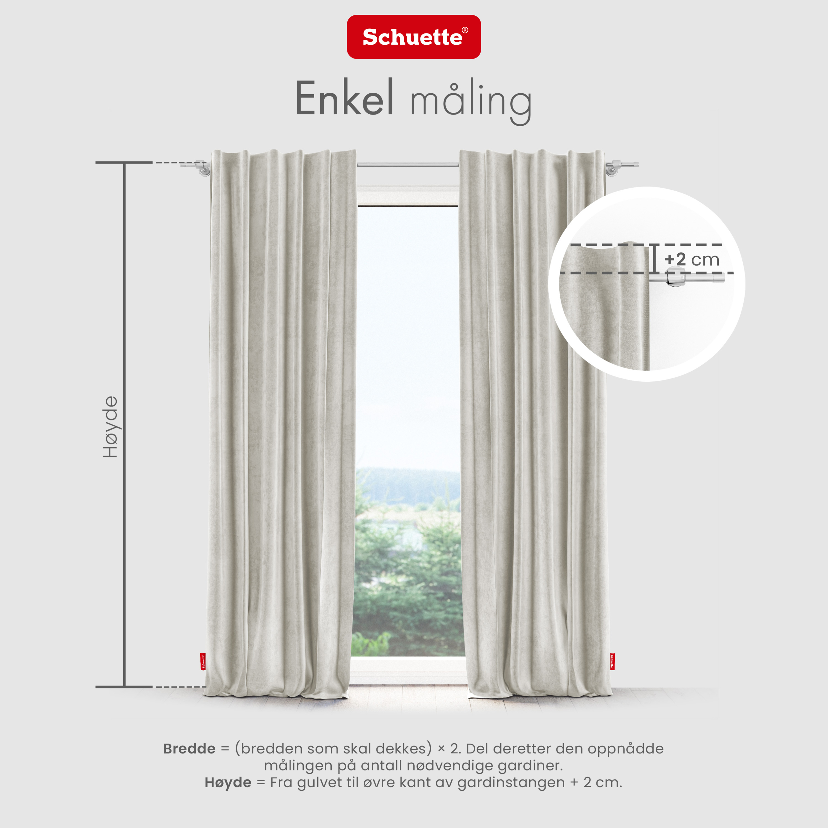 - Måleanvisning: Høyde = Mål gardinhøyden fra gulvet til gardinskinnen eller toppen av gardinstangen og legg til minst 4 cm slik at gardinen minst berører gulvet. Bredde = (bredde som skal tildekkes) x 2. Del deretter det resulterende målet med ønsket antall skjerf; alle Schuette®-gardinmål som tilbys er bredde x høyde.