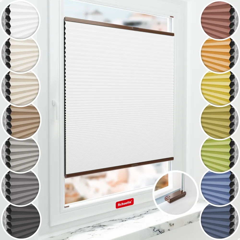 Schuette® Plissegardin med bikakestruktur mørkleggingsplissegardin med boring etter mål • Blackout x Honey kolleksjon: Moonlight (Hvit) • Suprafix Brakett "Med boring" • Profilfarge: Brun