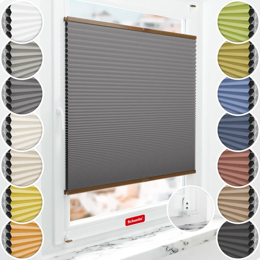 Schuette® Plissegardin med bikakestruktur mørkleggingsplissegardin med boring etter mål • Blackout x Honey kolleksjon: Twilight Tango (Grå) • Suprafix "Double 2in1" skrue- og klemholder • Profilfarge: Eik