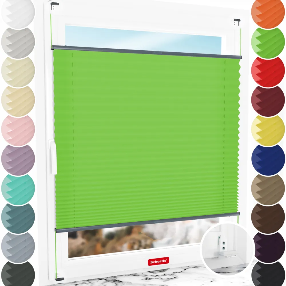 - Funksjoner Schuette® plisségardiner med boring: Trinnløst justerbare (opp og ned), dobbeltspente (INGEN svaiing), spesielle aluminiumsprofiler (INGEN! bøying/brudd), ferdig montert så langt det er mulig (INGEN! tråkking av plissésnoren / INGEN tidkrevende montering av mange enkeltdeler).