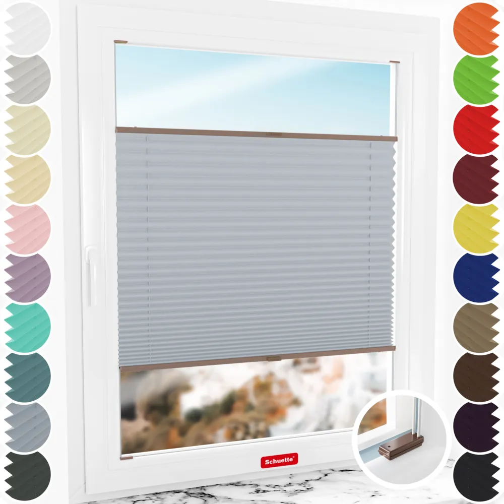 Schuette® Plissegardin med boring etter mål • Premium kolleksjon: Silver Sonata (Grå) • Suprafix Brakett "Med boring" • Profilfarge: Brun