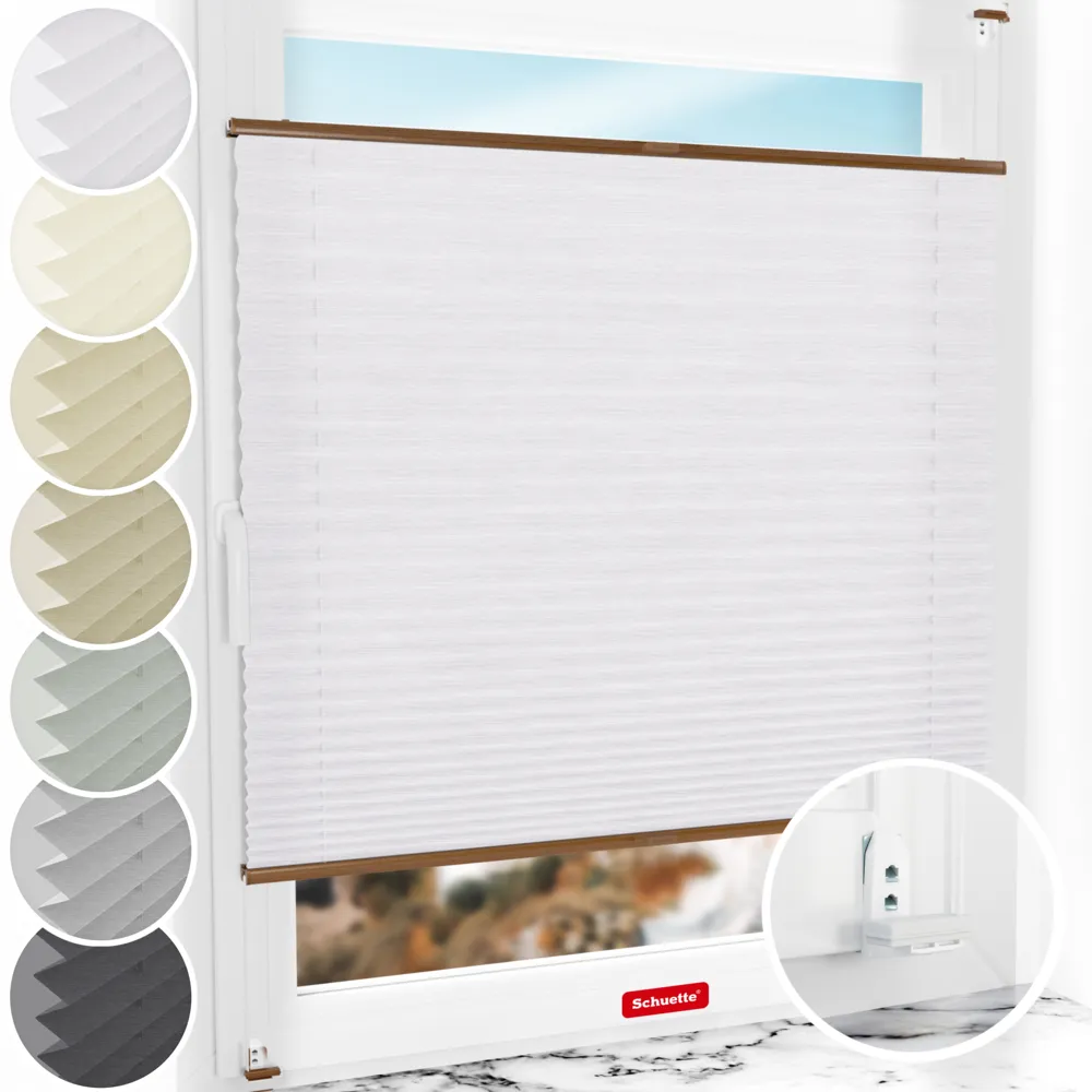 - Funksjoner Schuette® plisségardiner uten boring: Trinnløst justerbar (opp og ned), dobbelt strammet (INGEN svingning), spesielle aluminiumsprofiler (INGEN! bøying/brudd), ferdig montert så langt det er mulig (INGEN! tråkking av plissésnoren / INGEN tidkrevende montering av mange enkeltdeler).