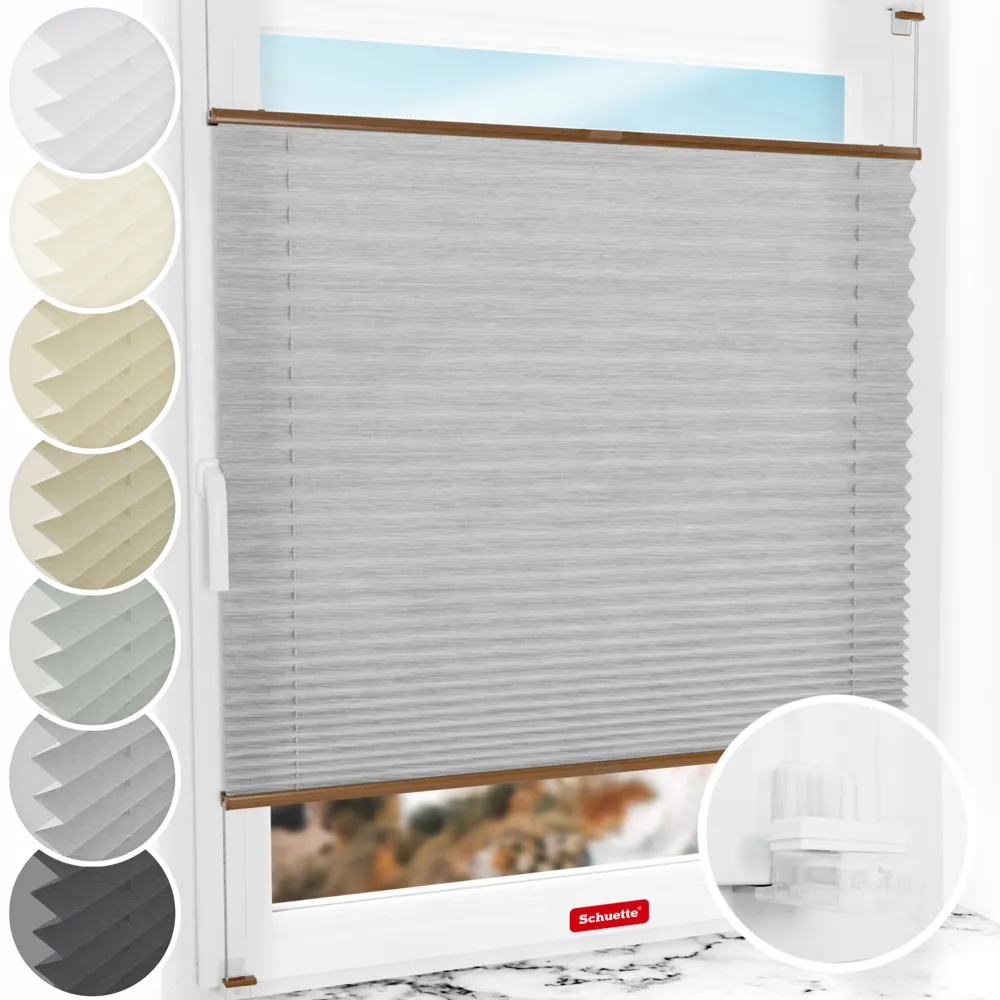 Schuette® Plissegardin uten boring etter mål • Dolomite kolleksjon: Storm Gray (Grå) • Suprafix klemfeste "Incognito X" • Profilfarge: Eik