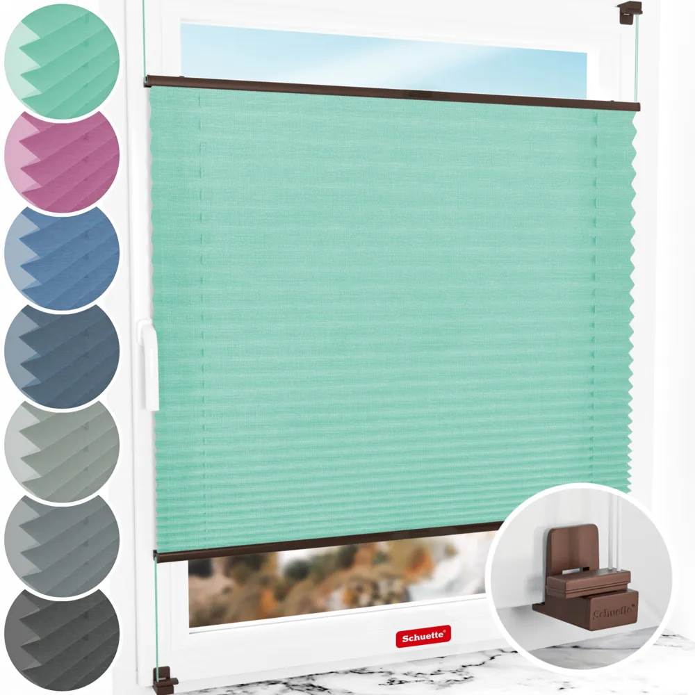 Schuette® Plissegardin uten boring etter mål • Melange kolleksjon: Mint Ice Cream (Grønn) • Suprafix klemfeste "For stramming" • Profilfarge: Brun