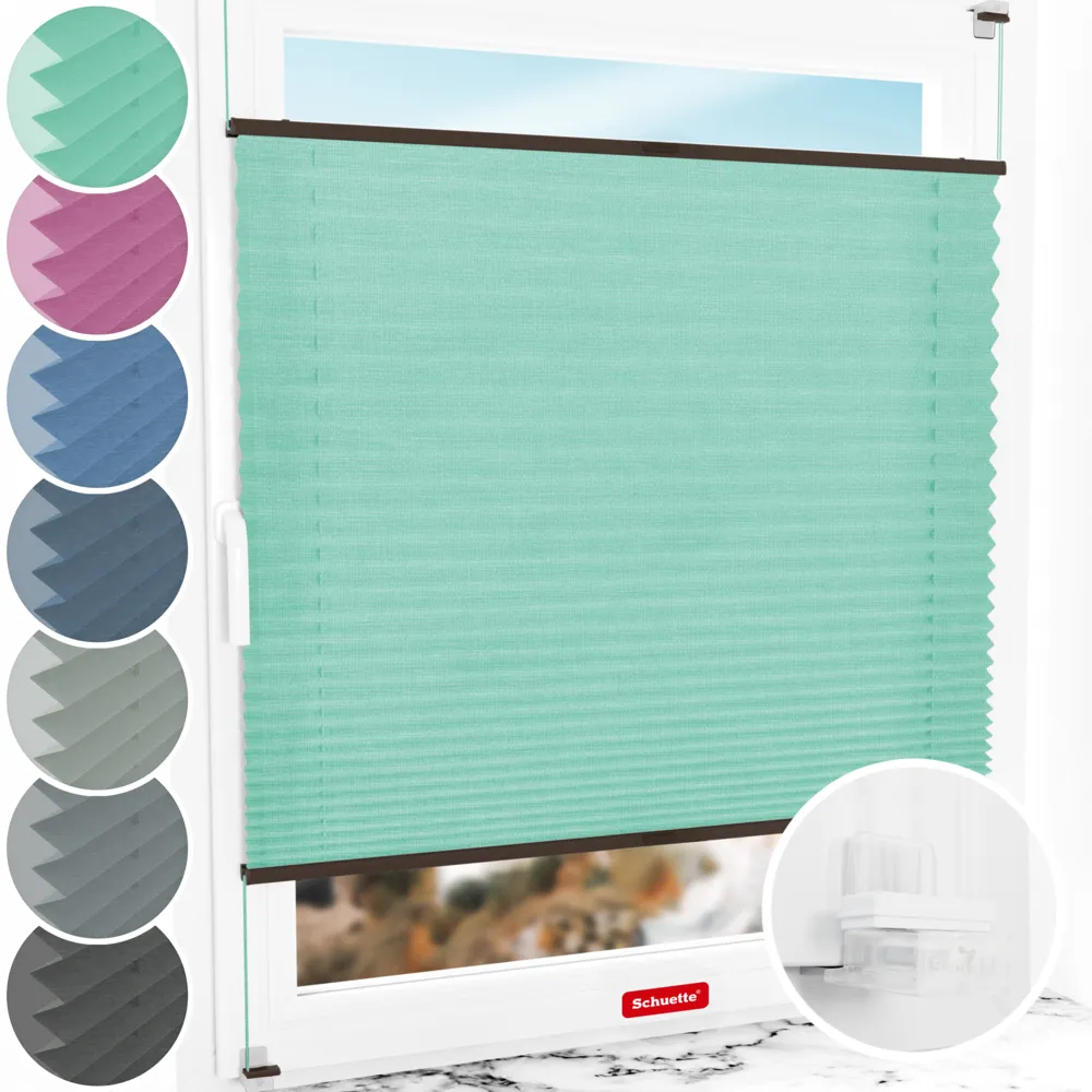Schuette® Plissee ohne Bohren nach Maß • Melange Kollektion: Mint Ice Cream (Grün) • Suprafix Klemmhalter “Incognito X" • Profilfarbe: Walnuss