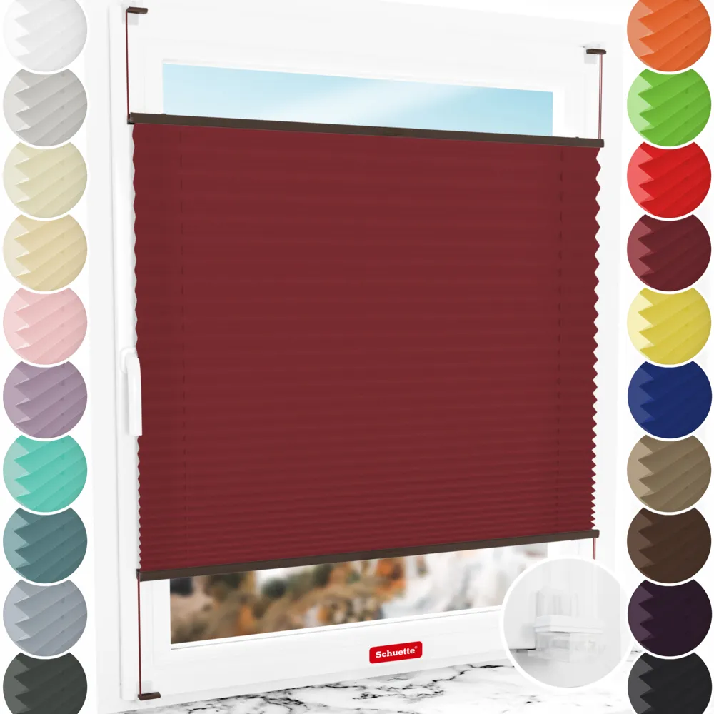 Schuette® Plissee ohne Bohren nach Maß • Premium Kollektion: Ruby Riddle (Dunkelrot) • Suprafix Klemmhalter “Incognito X" • Profilfarbe: Walnuss