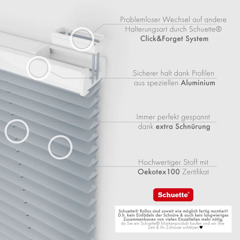 TL;DR Plissees ohne Bohren werden einfach an die ohne Bohren angebrachten Befestigungen angeklickt. Das Click&Forget Klicksystem am Plissee ist universell und auch bei jeder Schuette® Befestigung gleich, weshalb jederzeit zu anderen hauseigenen Plissee Halterungen gewechselt werden kann.