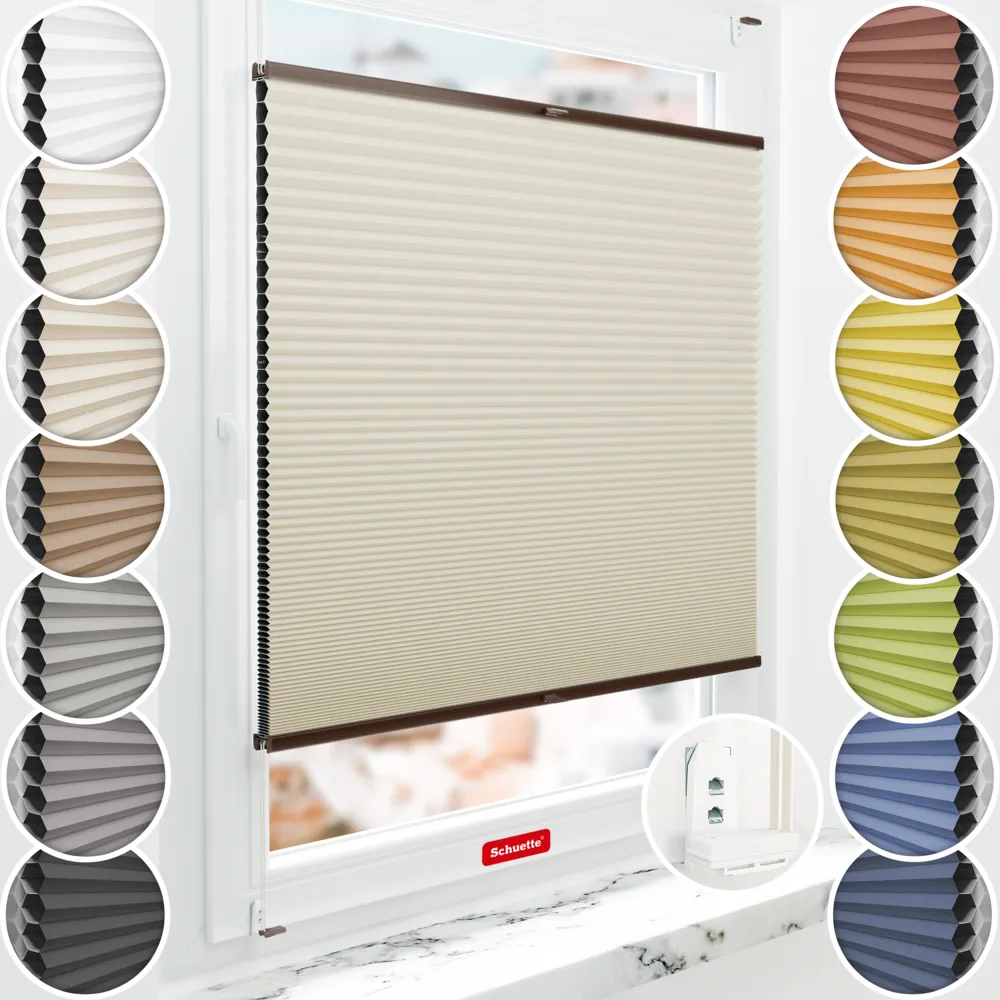 Schuette® Wabenplissee Verdunklungsplissee mit Bohren nach Maß • Blackout x Honey: Belgian Waffle (Creme) • Suprafix "Double 2in1" Schraub- & Klemmhalter • Profil: Braun