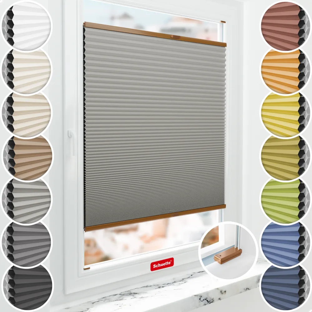 Schuette® Wabenplissee Verdunklungsplissee mit Bohren nach Maß • Blackout x Honey: Silver Mist (Grau) • Suprafix Halterungen "Mit Bohren" • Profil: Eiche