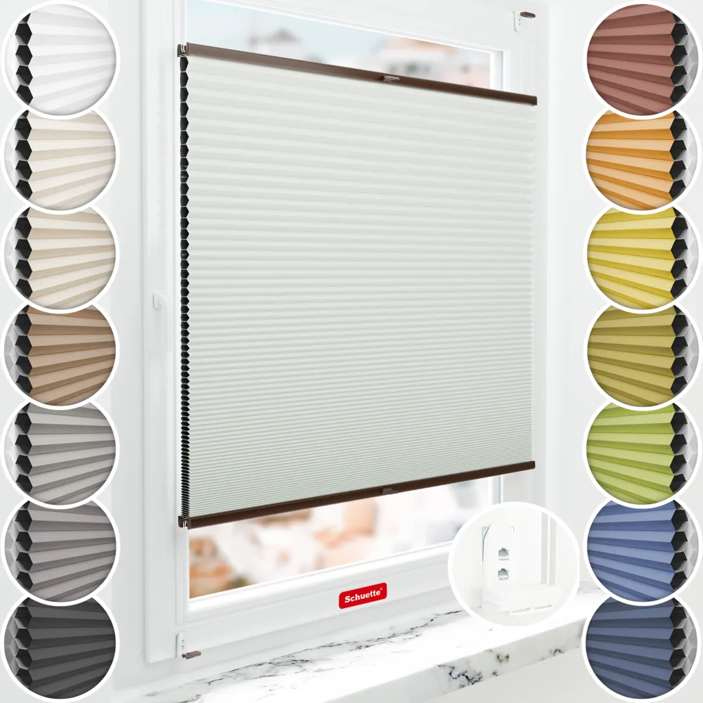 Die Halterungen sind so konzipiert, dass sie bei Bedarf leicht durch andere Schuette®-Halterungen ersetzt werden können. Bitte kontaktieren Sie unseren Kundenservice für weitere Informationen, da ggf. Änderungen in den Plisseemaßen durchgeführt werden müssen.
